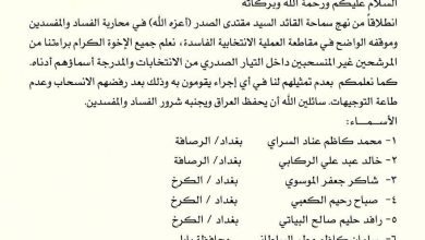 نشر المكتب الخاص لزعيم التيار الصدري اسماء المرشحين الرافضين الانسحاب من الانتخابات ، وتبرؤ الصدر من مرشحي التيار الرافضين الانسحاب…