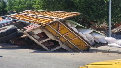 بسبب التخسفات … انقلاب لوري يحمل مادة طحين الحصة التموينية وسط بغداد