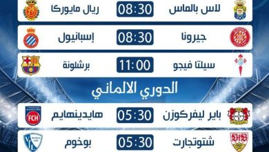 -  الرياضة والفن  جدول مباريات الدوريات الكبرى لهذا اليومجدول مباريات الدوريات الاوروبية الكبرى ، الاسباني والانكليزي الممتاز والايطالي والالماني ، ابرزها لقاء مانشستر ستي و توتنهام ، وبرشلونة… اكمل القراءة