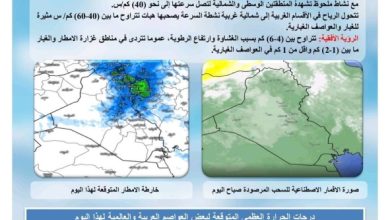 توقعت الهيئة العامة للأنواء الجوية، اليوم الإثنين، طقساً غائماً مع زخات مطر متفاوتة الشدة في الوسطى والشمالية، قد تكون رعدية…