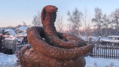 صنع النحات إيفان بوبوسوف من جمهورية ساخا-ياكوتيا بسيبيريا الروسية تمثالا ضخما على هيئة حية رمز هذا العام حسب التقويم الصيني…