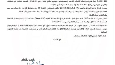 قررت لجنة الانضباط في اتحاد الكرة العراقي اعتبار نادي عفك خاسراً أمام فريق الفهد بنتيجة 3-0 ضمن منافسات الدوري العراقي…