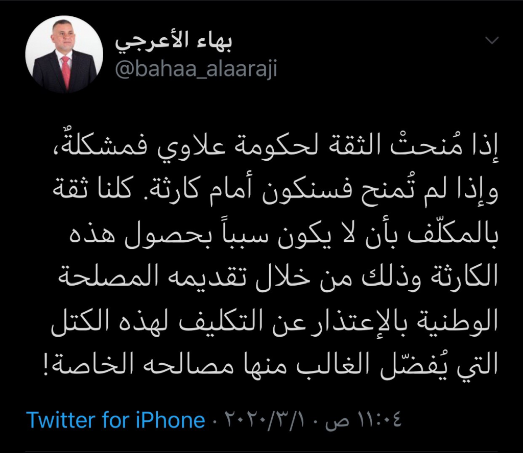الرئيسية/اخبـار العراق/الاعرجي: إذا مُنحتْ الثقة لحكومة علاوي فمشكلةٌ وإذا لم تُمنح فسنكون أمام كارثة اخبـار العراق أخر الأخبار الاعرجي: إذا مُنحتْ الثقة لحكومة علاوي فمشكلةٌ وإذا لم تُمنح فسنكون أمام كارثة 2020-03-01 232 2020-03-01 232 شاركها فيسبوك X لينكدإن Tumblr بينتيريست Reddit VKontakte Odnoklassniki Pocket مشاركة عبر البريد طباعة