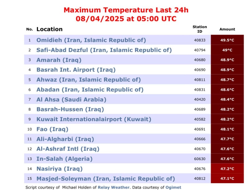 أعلن موقع دولي مختص بدرجات الحرارة، اليوم الإثنين تسجيل 7 مدن عراقية أعلى درجة حرارة على مستوى العالم ضمن 15 مدينة.