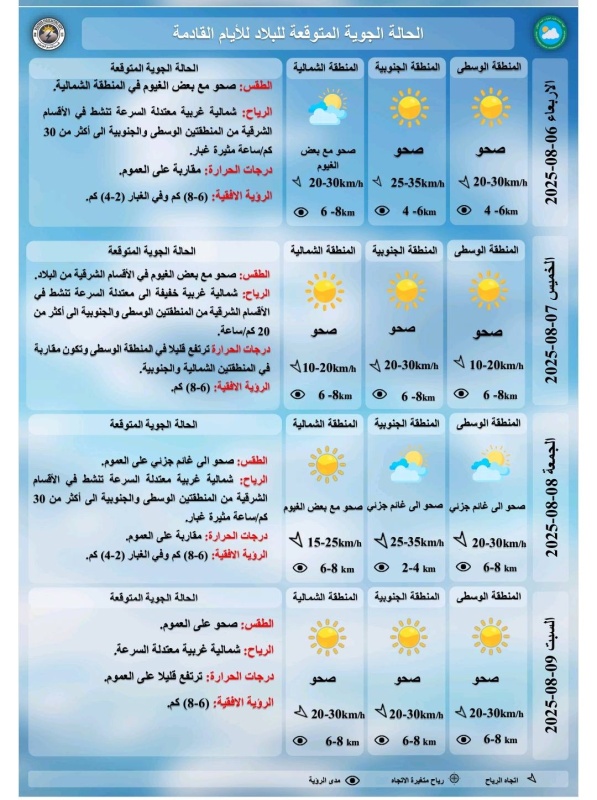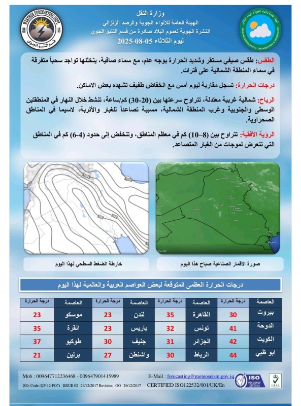تشير توقعات الطقس، اليوم الثلاثاء ، الى أن سماء البلاد صافية ذات طقس صيفي مستقر شديد الحرارة، فيما تتواجد بعض السحب المتفرقة في شمال البلاد، بينما تكون درجات الحرارة مقاربة لدرجات يوم امس.