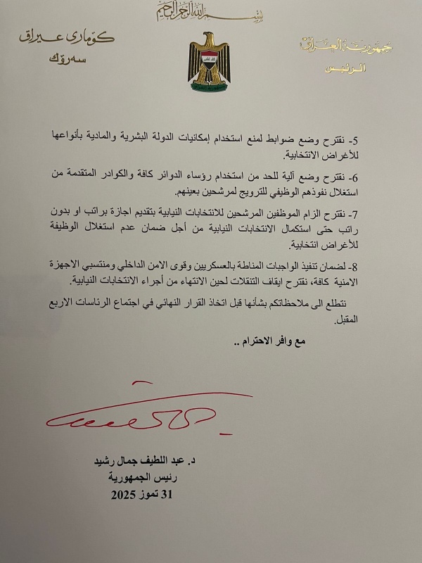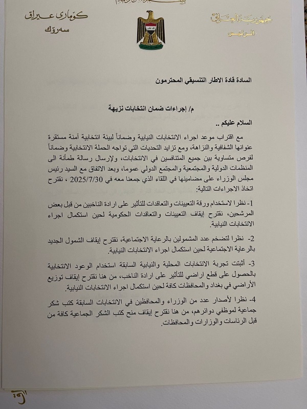 وجّه رئيس الجمهورية عبد اللطيف جمال رشيد، اليوم الثلاثاء ، رسالة رسمية إلى قادة الإطار التنسيقي، تضمنت سلسلة مقترحات تهدف لضمان إجراء الانتخابات النيابية المقبلة في بيئة آمنة ونزيهة، ومنع استغلال موارد الدولة لأغراض انتخابية.