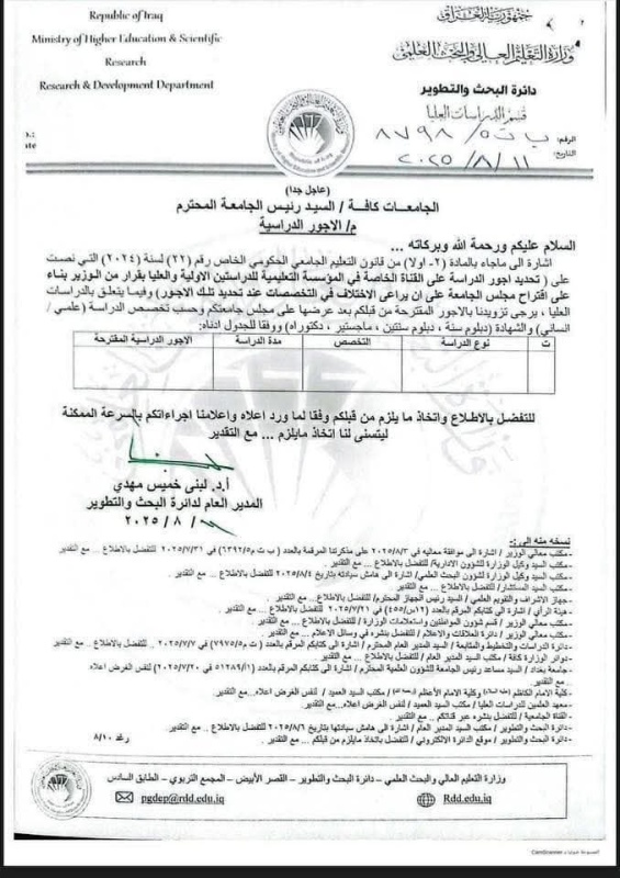 وبحسب الوثيقة أدناه ، فأن الوزارة منحت الصلاحية للجامعات فيما يخص تحديد اجور الدراسة على القناة الخاصة في المؤسسة التعليمية للدراستين الأولية والعليا بقرار من الوزير بناء على اقتراح مجلس الجامعة على ان يراعى الاختلاف في التخصصات عند تحديد تلك الأجور: