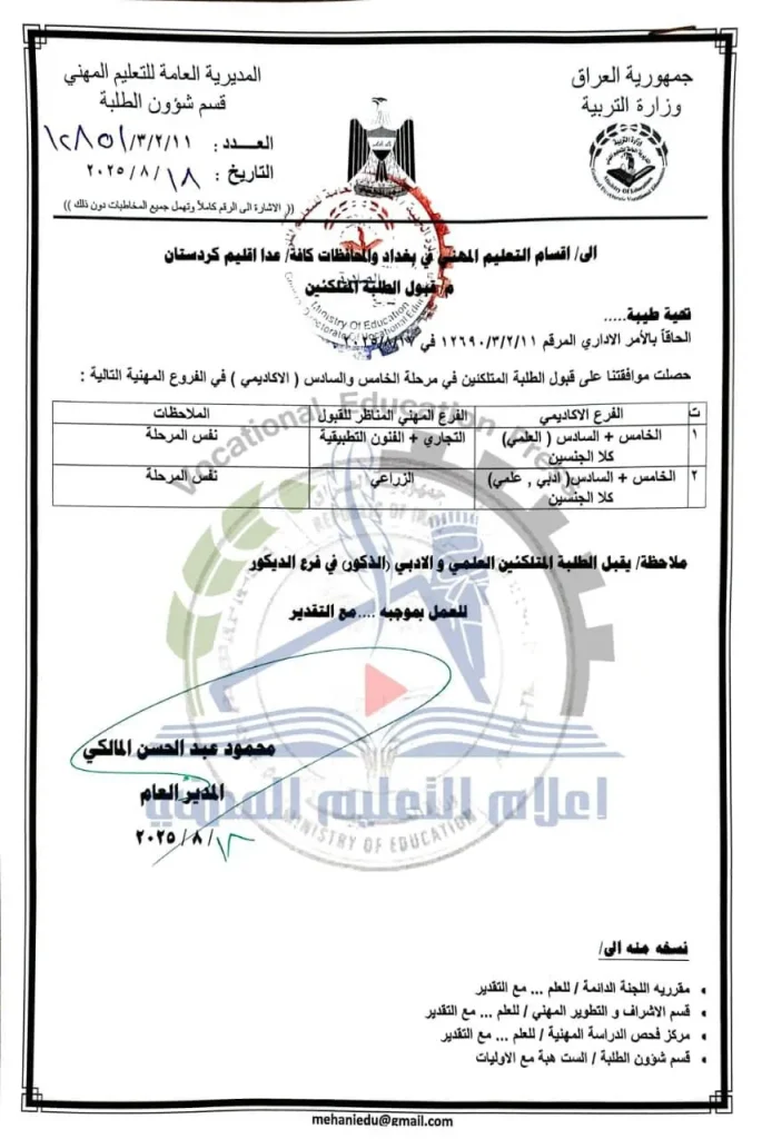 قررت وزارة التربية، اليوم الإثنين، السماح لطلبة الصف الخامس والسادس الاعدادي المتلكئين من الفرع العلمي فقط بالتقديم على القسمين المهنيين (التجاري والفنون التطبيقية) المناظر للقبول ولكلا الجنسين، فيما سمحت لطلبة الفرع الادبي والعلمي بالتقديم على القسم (الزراعي) ولكلا الجنسين أيضا، أما الطلبة الذكور فيسمح لهم بالتقديم على قسم الديكور وكما موضح في الأدنى:
