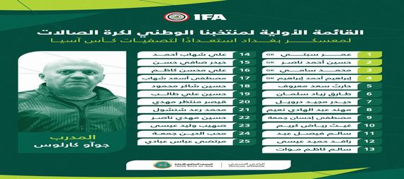 أعلن الجهازُ الفنيُّ لمنتخبنا الوطنيّ لكرة الصالات، بقيادة المدرب البرازيلي جوآو كارلوس باربوسا، القائمةَ الأولية المستدعاة للمعسكر الداخليّ الذي سينطلق بعد غدٍ الخميس في العاصمةِ بغداد، تحضيرًا للاستحقاقِ القاريّ المقبل.