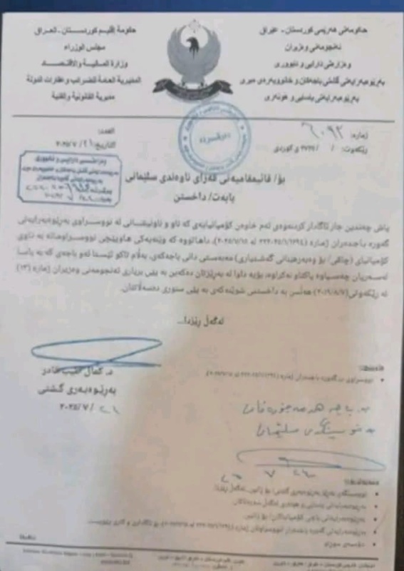 وذكرت المديرية بحسب وثيقة تلقتها “وطن نيوز”، اليوم الأحد أنها تطالب قائممقامية السليمانية، بالمباشرة بإغلاق منتجع “جافي لانـد”، استناداً إلى قرار مجلس وزراء الإقليم.