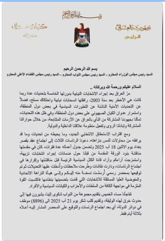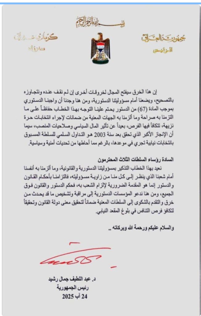 وجه رئيس الجمهورية عبد اللطيف جمال الرشيد، اليوم الأحد رسالة إلى رئاستي مجلس الوزراء والنواب تتعلق بحدوث خرق في العملية الانتخابية يهدد نزاهتها وشفافيتها، مشدداً على ضرورة التزام الرئاسات الثلاث بأحكام الدستور وضمان نزاهة الانتخابات.