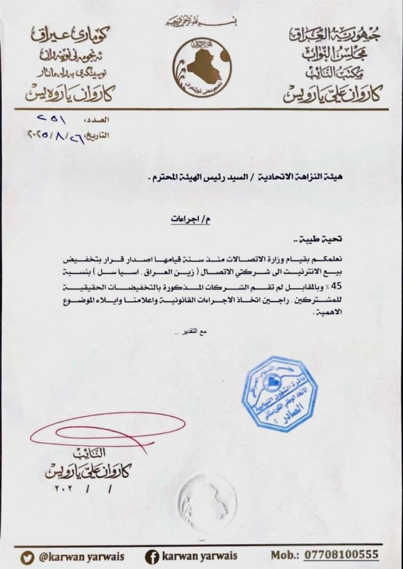أظهرت وثيقة صادرة عن مكتب النائب كاروان ياروايس، حصلت عليها “وطن نيوز”، اليوم الثلاثاء ، توجيه كتاب رسمي إلى هيئة النزاهة الاتحادية بشأن قيام وزارة الاتصالات ببيع خدمة الإنترنت لشركتي “زين العراق” و”آسياسيل” بخصم يصل إلى 45% خلافًا للسياقات القانونية.