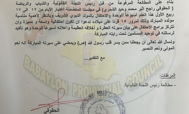ونشر المجلس كتاباً رسمياً اطلعت “وطن نيوز” عليه ان المجلس وافق على مقترح تقدم به احد اعضاء المجلس بأعتبار اسبوع المولد النبوي “12-17” ربيع الاول اسبوعا للوحدة الوطنية .