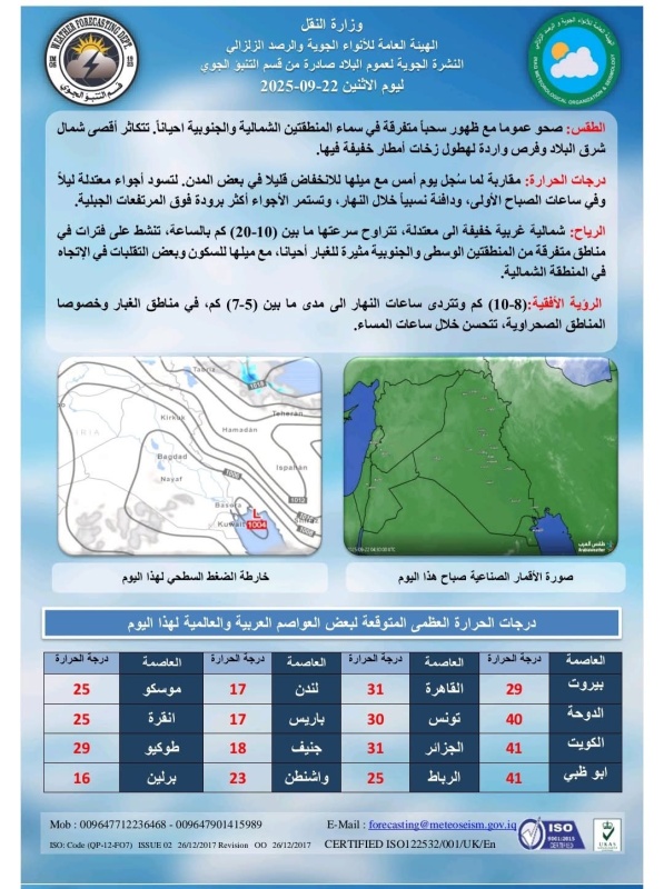 توقعت هيئة الأنواء الجوية، اليوم الإثنين ، طقسا صحوا في عموم البلاد مع سحب متفرقة في المنطقتين الشمالية والجنوبية.