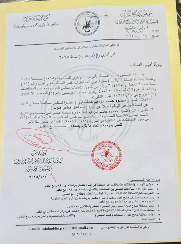 حصلت “وطن نيوز”، اليوم الخميس على وثائق رسمية تؤكد أن مجلس محافظة صلاح الدين قرر إنهاء عضوية عضو المجلس إسماعيل خضير هلوب، وذلك بعد شموله بإجراءات المساءلة والعدالة، فيما تم اختيار محمود جاسم الحشماوي بديلاً عنه.
