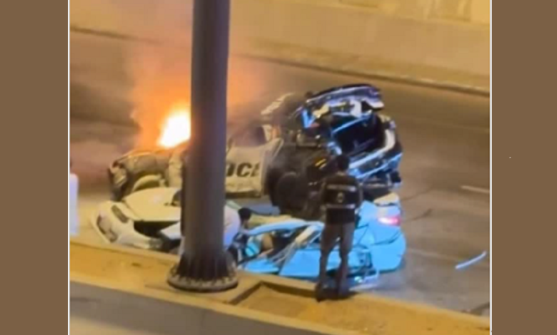 وتداولت حسابات بمواقع التواصل الاجتماعي، صورا من الحادث المأساوي، وتظهر فيه سيارة مهشمة إلى جانب سيارة الشرطة تشتعل فيها النيران.