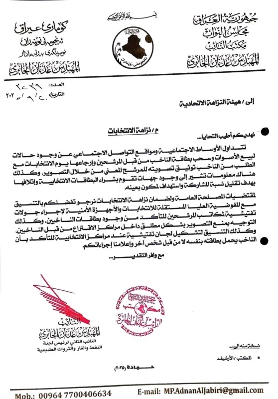 طلب نيابي إلى هيئة النزاهة بشأن “شراء البطاقات الانتخابية”