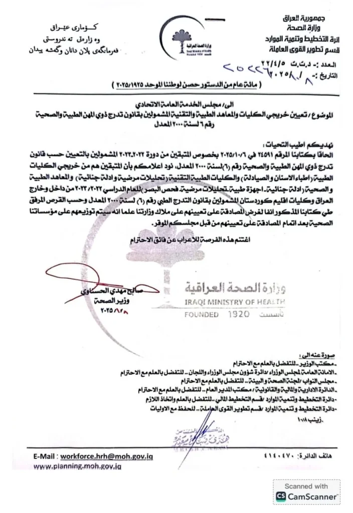 خاطبت وزارة الصحة، اليوم الخميس، مجلس الخدمة العامة الاتحادي لتعيين خريجي الكليات والمعاهد الطبية والتقنية المشمولين بقانون تدرج ذوي المهن الطبية والصحية.