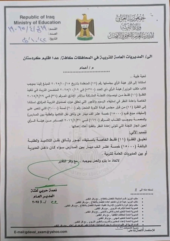 وذكرت الوزارة بحسب وثيقة تلقتها “وطن نيوز”، اليوم الخميس (23 تشرين الأول 2025)، أن “المديرية العامة للتقويم والامتحانات أصدرت تعميماً إلى المديريات العامة للتربية في المحافظات كافة (عدا إقليم كردستان)، استناداً إلى قرار هيئة الرأي في جلستها رقم (17) المنعقدة بتاريخ 15 تشرين الأول 2025، القاضي بالتريث في تنفيذ الفقرة (11) من توصيات اللجنة المشكلة بالأمر الإداري رقم (36) لسنة 2015، الخاصة باستيفاء الرسوم والأجور التي تحقق موارد الصندوق المركزي للتربية”.