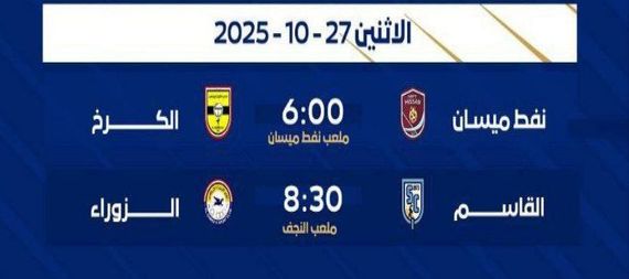 تجمع لمباراة الاولى نفط ميسان و الكرخ في ملعب الاول ، الساعة 6 مساء ، والثانية تجمع القاسم والزوراء في ملعب النجف في الساعة 8.30 مساء.