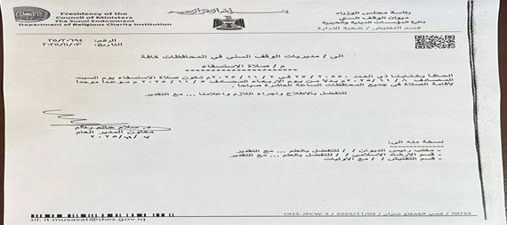 ووجه الوقف السني في كتاب ، باقامة صلاة الاستسقاء يوم السبت القادم المصادف 8 / 11 /2025 في تمام الساعة العاشرة صباحاً في عموم محافظات العراق.
