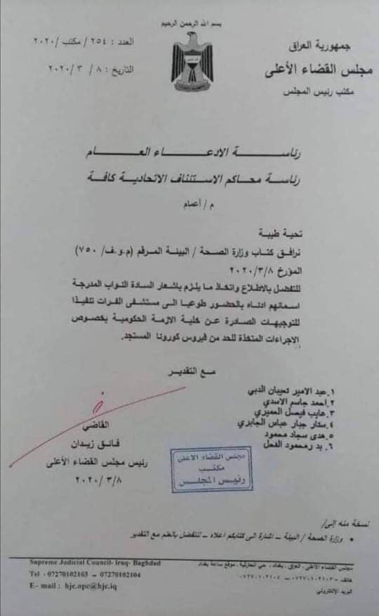 حصلت وكالة أحداث الوطن اليوم السبت، على وثيقة صادرة من مجلس القضاء الأعلى، تتضمن حضور طوعي لستة نواب ابرزهم احمد الاسدي المتحدث باسم تحالف الفتح، وذلك للحد من فايروس كورونا المستجد.