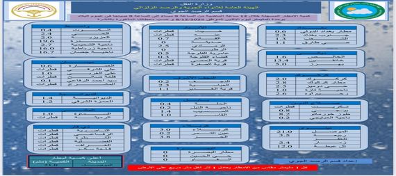 اعلنت هيئة الانواء الجوية عن كمية الامطار المتساقطة على البلاد خلال ال 12 ساعة الماضية من التاسعة مساء الى التاسعة صباحاً اليوم الاثنين الموافق 8/12/2025والصادرة من قسم الرصد الجوي.