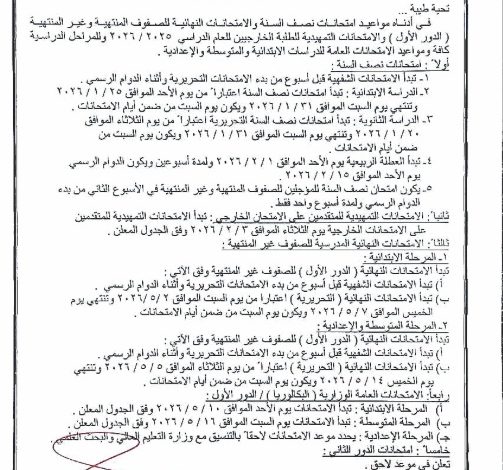 وقالت الوزارة في بيان ان “اللجنة الدائمة للامتحانات العامة تعلن مواعيد امتحانات نصف السنة والامتحانات النهائية للصفوف المنتهية وغير المنتهية ( الدور الأول ) والامتحانات التمهيدية للطلبة الخارجيين للعام الدراسي 2025_2026 وللمراحل الدراسية كافة”. وبينت ان “امتحانات نصف السنة للمرحلة الابتدائية تنطلق يوم الاحد الموافق 1/25 ولغاية يوم السبت الموافق 1/31 فيما ستبدأ امتحانات المرحلة الثانوية يوم الثلاثاء الموافق 1/20، وحسب الجدول الموضح: