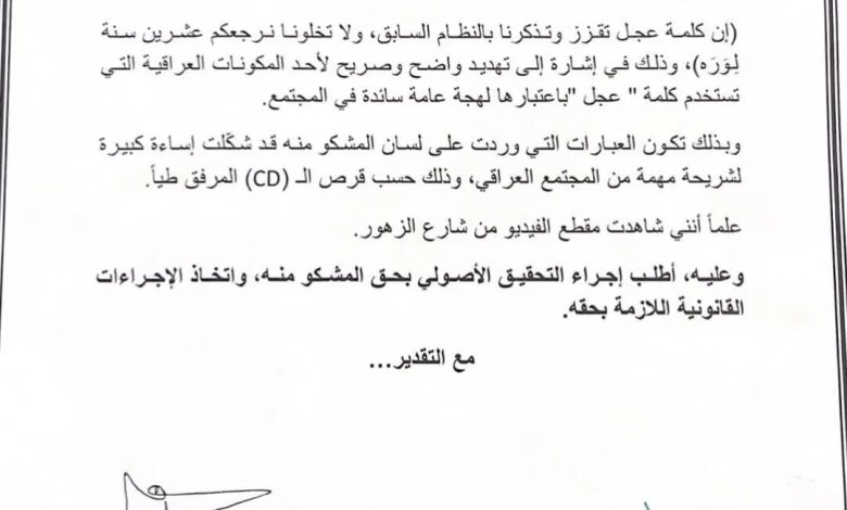 قدّم محامٍ عراقي، يوم الثلاثاء، إخباراً رسمياً إلى قاضي محكمة تحقيق تكريت، بحق المحلل السياسي “عماد المسافر” بتهمة الإساءة لأحد المكوّنات الرئيسة وتهديد السلم المجتمعي في البلاد.وجاء في وثيقة قدمها المحامي، مصعب مقداد، إن الاخبار يأتي بشأن مقطع فيديو جرى تداوله على مواقع التواصل الاجتماعي بتاريخ 6/1/2026، يظهر فيه المشتكى منه عماد محسن حسن المسافر، وهو يسيء إلى أحد مكونات الشعب العراقي من خلال عبارات وردت على لسانه.وبحسب الإخبار، فإن المشتكى منه قال: “إن كلمة عجل تفرز وتذكرنا بالنظام السابق، ولا تخلونا نرجعكم عشرين سنة لورا”، في إشارة عُدّت تهديداً واضحاً وصريحاً لأحد المكونات العراقية، ولا سيما أن كلمة “عجل” تُستخدم كلجة عامة سائدة في المجتمع.وأوضح الإخبار أن العبارات المذكورة شكّلت إساءة كبيرة لشريحة مهمة من المجتمع العراقي، وذلك استناداً إلى ما ورد في قرص (CD) المرفق طياً مع الإخبار.وطالب المحامي، مقدّم الإخبار، بإجراء التحقيق الأصولي بحق المشتكى منه، واتخاذ الإجراءات القانونية اللازمة بحقه.وتعد مفردة “عجل” من المفردات الدارجة المستخدمة لدى شريحة من العراقيين، ولا سيما في المحافظات الغربية وأجزاء من الشمالية، في سياق التخاطب اليومي، ويقابلها في لهجات الجنوب لفظ “چا”، وفي الوسط “لعد”، وغالباً ما تُستخدم بالمعنى القريب من “إذن” أو كأداة استئناف للحديث.وكانت مواقع التواصل الاجتماعي قد تداولت على نطاق واسع مقطع فيديو للمحلل السياسي عماد المسافر خلال مشاركته في برنامج تلفزيوني، ظهر فيه وهو يرفض حديث أحد الضيوف بسبب استخدام مفردة “عجل”، معتبراً أنها كانت تُستخدم من قبل رئيس النظام السابق، ما أثار جدلاً واسعاً بين المتابعين.