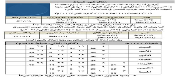 وذكر المركز التخصصي أنه ” يتوقع أن يكون هلال شهر شعبان مساء يوم الثلاثاء ( ٣٠ / رجب / ١٤٤٧هـ) الموافق ( ٢٠ / كانون الثاني / ٢٠٢٦م) في أفق مدينة النجف الأشرف عند غروب الشمس في الساعة (٥:٢٥).