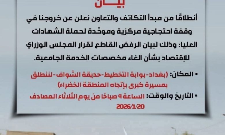 ثالثاً: التأكيد على أن هذا الحراك يمثل استنفاراً عاماً لجميع حملة الشهادات العليا دون استثناء، وندعو الجميع إلى تحمُّل المسؤولية والمشاركة الواسعة للحفاظ على حقوقهم، مع الالتزام التام بالانضباط والوحدة والطابع الحضاري السلمي للاحتجاج، بما يعكس مستواهم الثقافي والوطني.