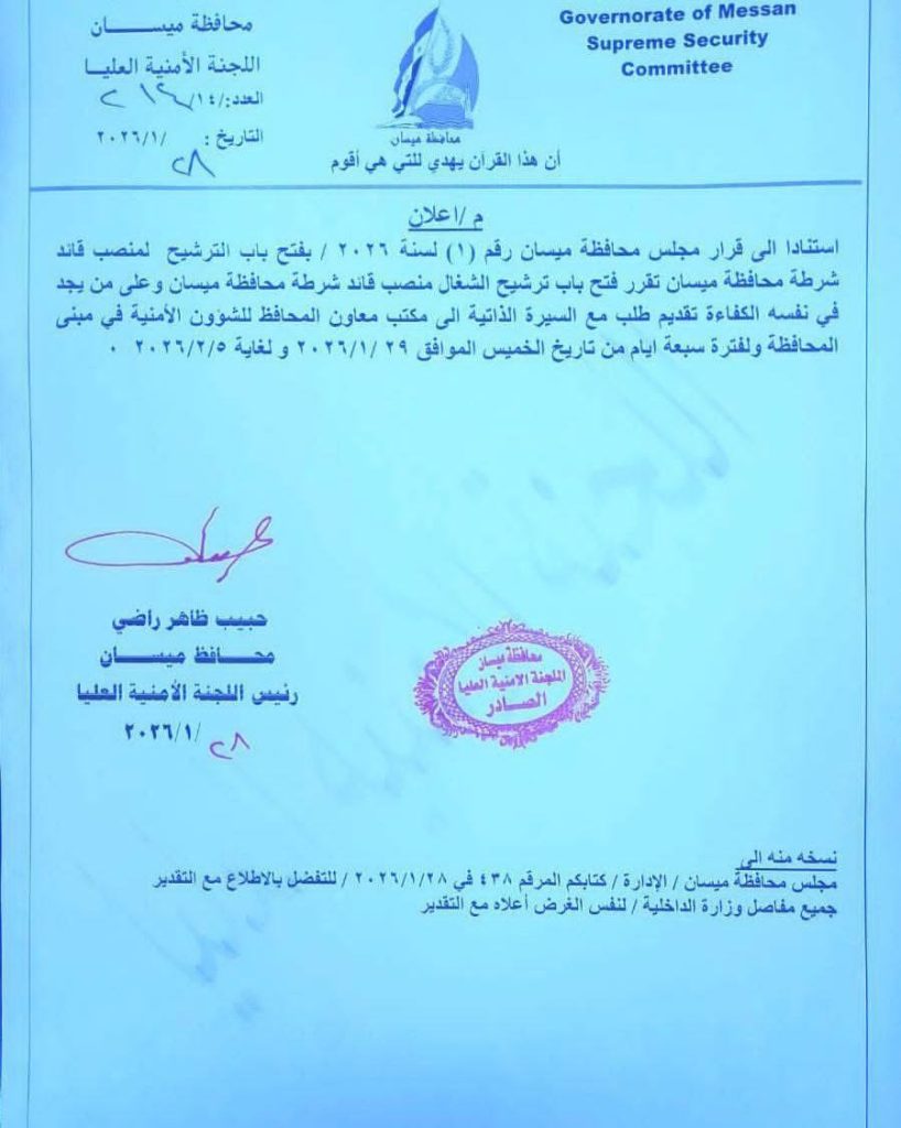 الرئيسية/اخبـار العراق/ديوان محافظة ميسان يفتح باب الترشيح لمنصب قائد شرطة المحافظة لمدة 7 أيام اخبـار العراق ديوان محافظة ميسان يفتح باب الترشيح لمنصب قائد شرطة المحافظة لمدة 7 أيام منذ ساعة واحدة 6 منذ ساعة واحدة 6 شاركها فيسبوك X لينكدإن Tumblr بينتيريست Reddit VKontakte Odnoklassniki Pocket مشاركة عبر البريد طباعة