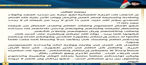 وليكن تواجدكم منظماً سلمياً يتجلله الوقار والهيبة والخضوع والمثول بين يدي إمامكم الحي… فهو يراكم وإن كنتم لا ترونه اليوم..