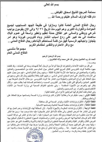 المرجع الفياض يدعو للالتزام بارشادات وزارة الصحة للحفاظ على الارواح والوطن