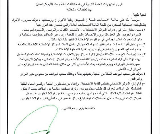 وأوضحت وزارة التربية في بيان :” أن التعليمات تضمنت تنظيم القاعات بدقة وفق خرائط جلوس محددة، مع وضع أسماء الطلبة على المقاعد وترك مسافات مناسبة بينهم، إلى جانب تفتيش الطلاب وإيداع الهواتف النقالة، إضافة إلى ترقيم نسخ الأسئلة وختمها وتوقيع مدير المركز لضمان سير الامتحانات بطريقة عادلة ومنظمة.
