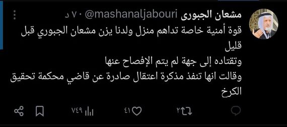 أكد السياسي العراقي النائب السابق مشعان الجبوري أن قوة أمنية خاصة اعتقلت ولده ” يزن مشعان الجبوري ” من منزله في بغداد بناء على مذكرة قبض صادرة من محكمة الكرخ.