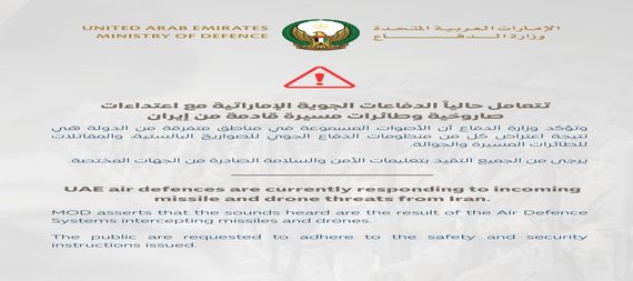 واكدت وزارة الدفاع:” أن الأصوات المسموعة في مناطق متفرقة من الدولة هي نتيجة اعتراض كل من منظومات الدفاع الجوي للصواريخ البالستية، والمقاتلات للطائرات المسيرة والجوالة.