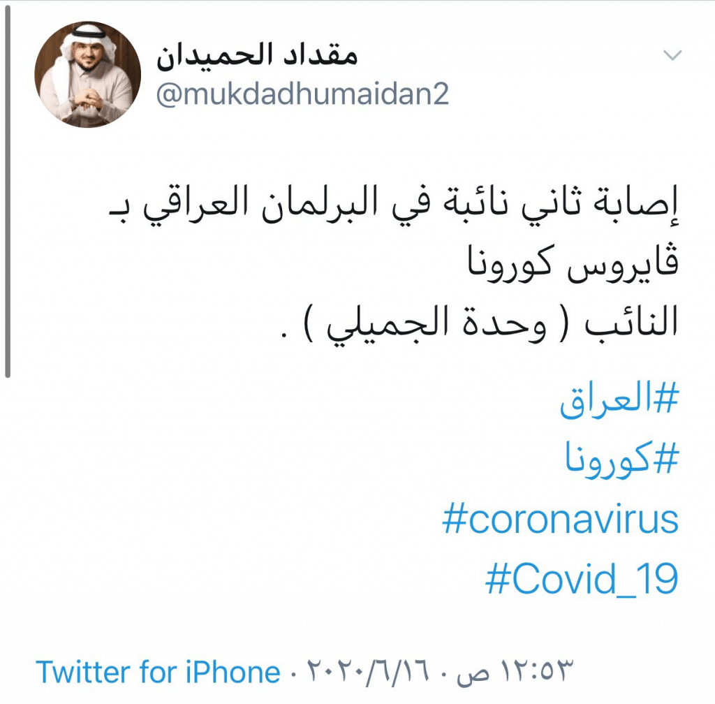انتشرت على مواقع التواصل الاجتماعي معلومات تشير الى اصابة النائبة وحدة الجميلي بفايروس كورونا وذلك بعد ان اعلنت نائبة عراقية امس الاثنين اصابتها بشكل رسمي بالفيروس عينه.