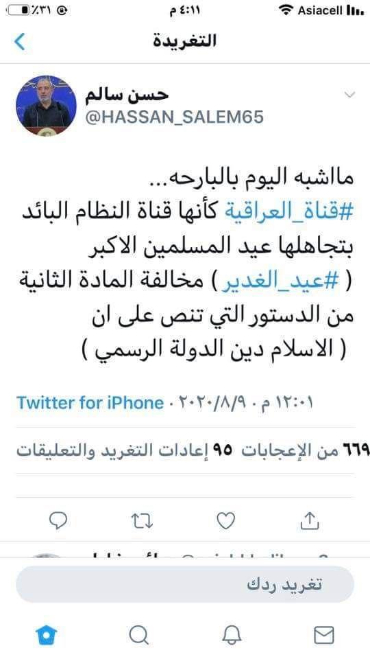 وصف عضو مجلس النواب حسن سالم، اليوم الاحد، قناة العراقية بانها كقناة النظام البائد بسبب تجاهلها لعيد الغدير.