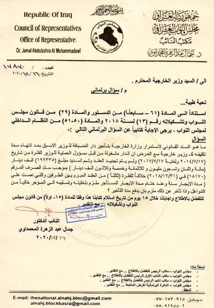 الرئيسية/اخبـار العراق/المحمداوي يوجه سؤالا للخارجية بشأن تأجير دار ضيافة للوزير الأسبق بعد انتهاء تكليفه اخبـار العراق أخر الأخبار المحمداوي يوجه سؤالا للخارجية بشأن تأجير دار ضيافة للوزير الأسبق بعد انتهاء تكليفه 2020-12-16 358 2020-12-16 358 شاركها فيسبوك X لينكدإن Tumblr بينتيريست Reddit VKontakte Odnoklassniki Pocket مشاركة عبر البريد طباعة