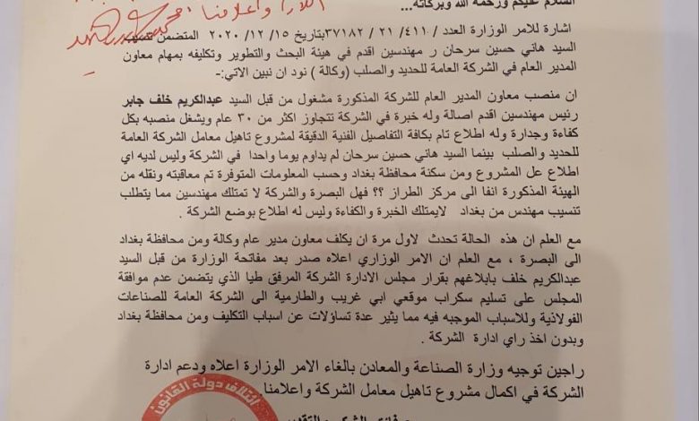 وأضاف عبد الصمد في الوثيقة الرسمية، ان “منصب معاون المدير العام للشركة المذكورة مشغول من قبل (عبد الكريم خلف جابر) رئيس مهندسين أقدم (اصالة) والذي يمتلك خبرة في الشركة تتجاوز أكثر من 30 عام ويعمل بكل كفاءة وجدارة وله إطلاع تام بكافة التفاصيل الفنية الدقيقة لمشروع تأهيل معامل الشركة العامة للحديد والصلب بينما (هاني حسين سرحان) لم يداوم يومًا واحدًا في الشركة وليس لديه أي إطلاع على المشروع ومن سكنة محافظة بغداد وحسب المعلومات المتوفرة تم معاقبته ونقله من الهيئة المذكورة انفا إلى مركز الطراز؟”.