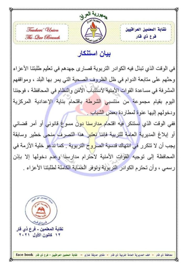 الرئيسية/اخبـار العراق/نقابة معلمي ذي قار تستنكر اقتحام الإعدادية المركزية من قبل بعض منتسبي الشرطة اخبـار العراق نقابة معلمي ذي قار تستنكر اقتحام الإعدادية المركزية من قبل بعض منتسبي الشرطة 2021-01-13 280 2021-01-13 280 شاركها فيسبوك X لينكدإن Tumblr بينتيريست Reddit VKontakte Odnoklassniki Pocket مشاركة عبر البريد طباعة