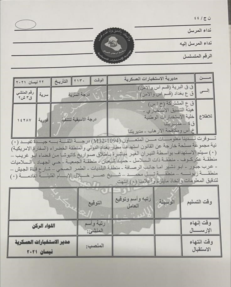 الرئيسية/اخبـار العراق/مخطط لقصف المنطقة الخضراء ومطار بغداد من ١٥ منطقة (وثيقة) اخبـار العراق أخر الأخبار مخطط لقصف المنطقة الخضراء ومطار بغداد من ١٥ منطقة (وثيقة) 2021-04-23 889 2021-04-23 889 شاركها فيسبوك X لينكدإن Tumblr بينتيريست Reddit VKontakte Odnoklassniki Pocket مشاركة عبر البريد طباعة