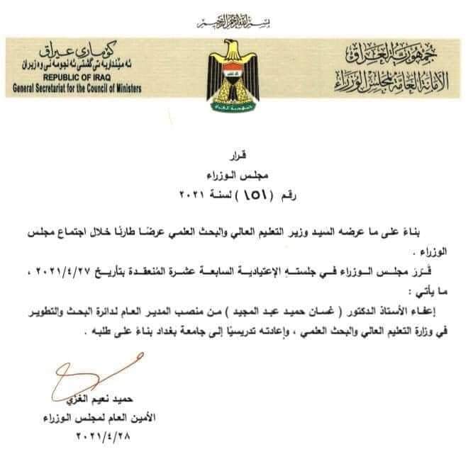 افادت مصادر سياسية رفيعة بان الامين العام لامانة مجلس الوزراء حميد الغزي قد اجبر وكيل وزير التعليم العالي وكالة ومدير عام دائرة البحث والتطوير الدكتور غسان حميد عبد المجيد على تقديم طلب إعفاءه من منصبه كون ان هذا المنصب اصبح من نصيب التيار الصدري الذي ينتمي له الغزي.