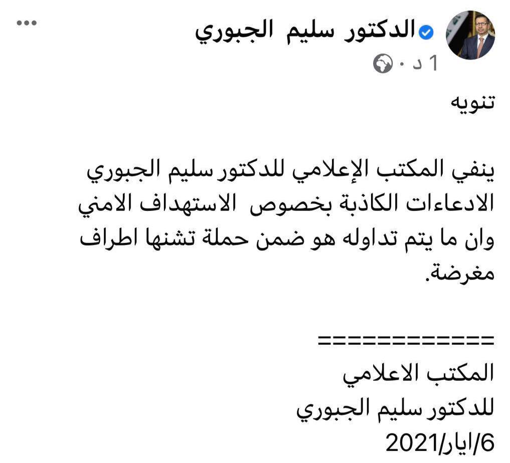 نفى مكتب رئيس البرلمان السابق سليم الجبوري اليوم الخميس، اعتقاله.