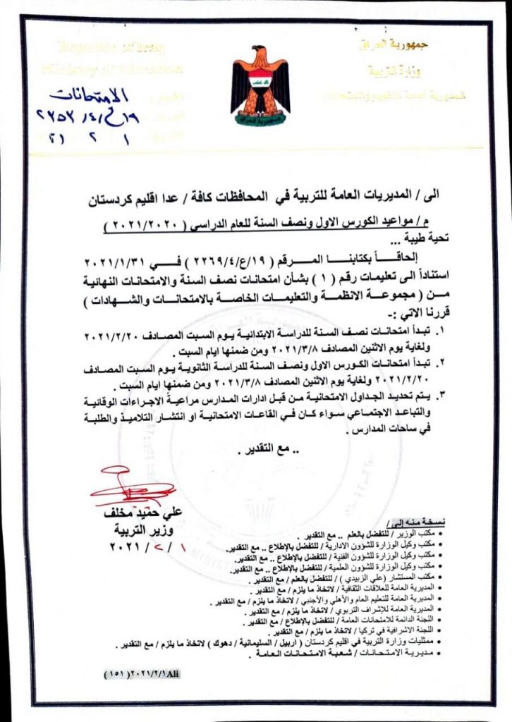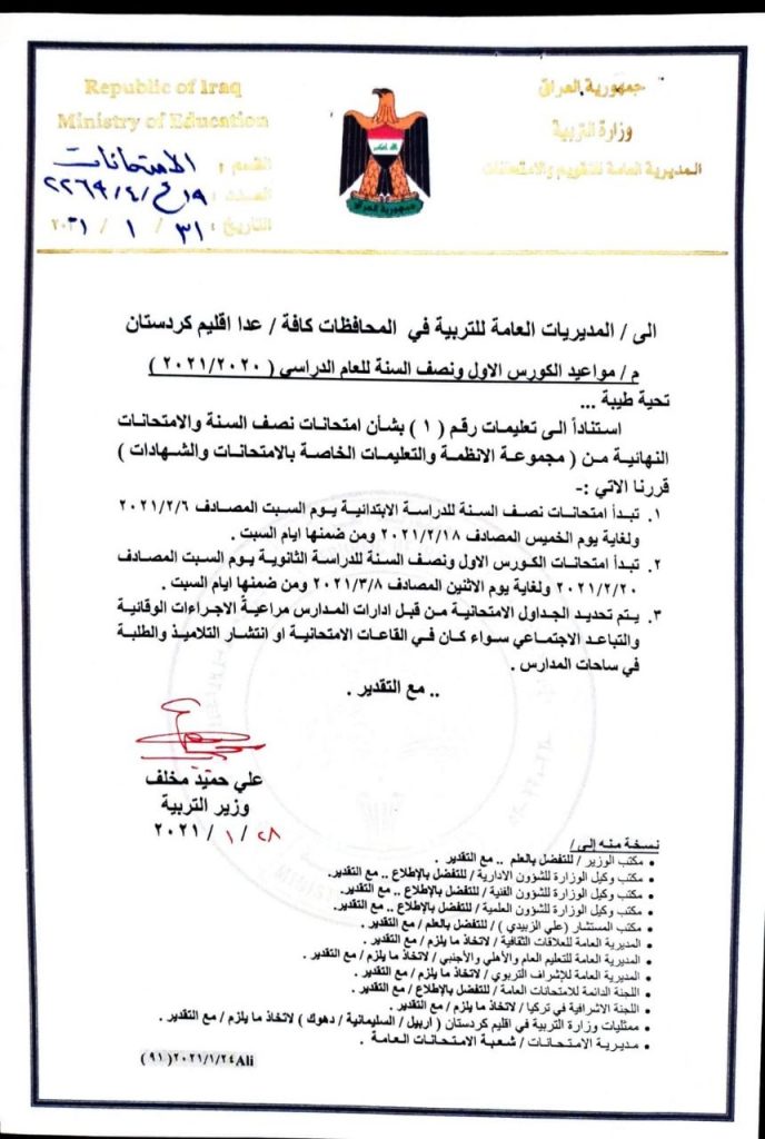 وبعد فترة قليلة اعلنت الوزارة من جديد تأجيل امتحانات نصف السنة ونهاية الكورس الاول من العام الدراسي الحالي (٢٠٢٠-٢٠٢١) الى إشعار آخر، فيما اعلنت عن جعل دوام المدرسين والمعلمين بنسبة ٢٥ بالمئة ويكون التواصل مع الطلبة الكترونيا.