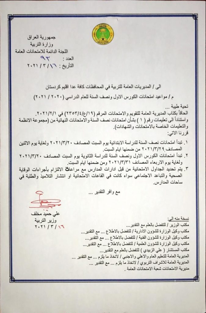 وبعد جميع القرارات السابقة عادت من جديد وزارة التربية الى تحديد موعد جديد للامتحانات ونو في الثالث من السنة الحالية وكما موضح بالوثيقة أدناه: