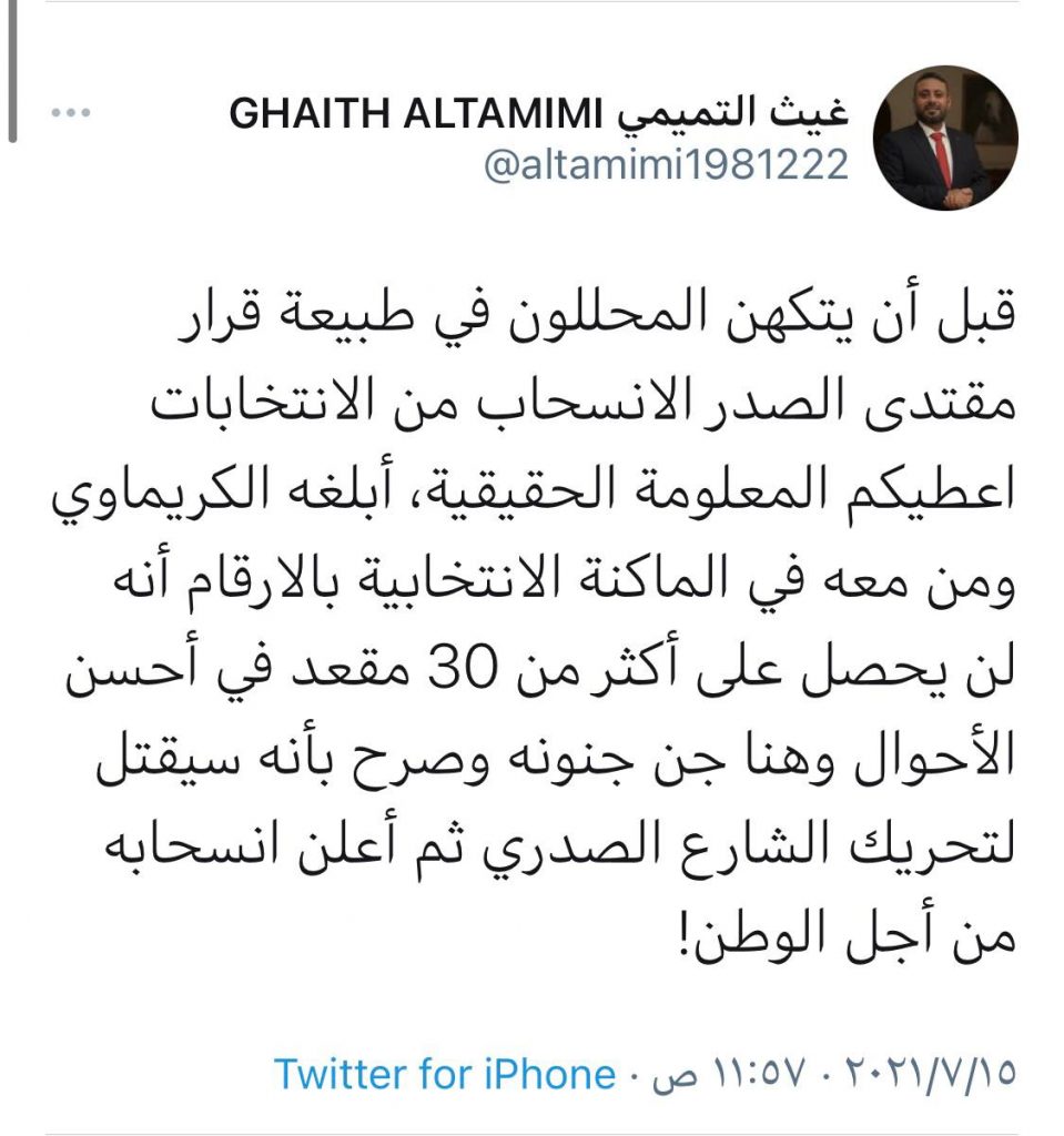 كشف السياسي العراقي في الخارج غيث التميمي، اليوم الخميس، عن السبب المباشر وراء انسحاب زعيم التيار الصدري مقتدى الصدر من الانتخابات.