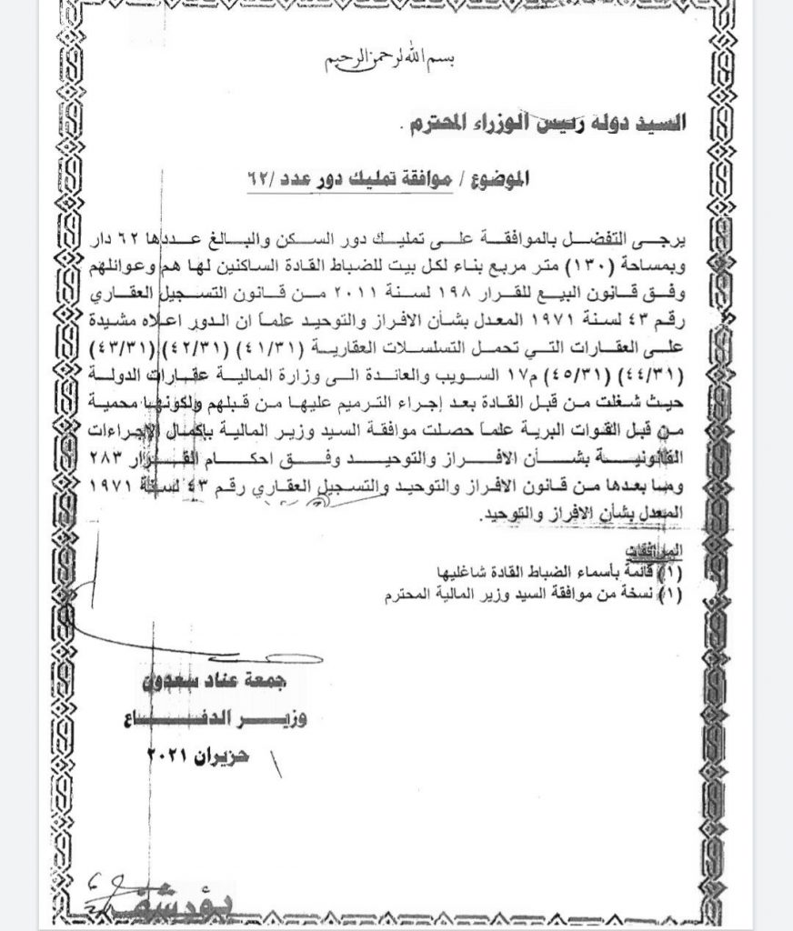 تنشر وكالة “احداث الوطن” اليوم الثلاثاء، وثائق تظهر قيام رئيس الوزراء مصطفى الكاظمي، بمنح مستشارين وزراء حاليين وبعض القيادات الامنية ٦٢ منزلا علما ان سعر الواحد منها يتجاوز مليون دولاراً.