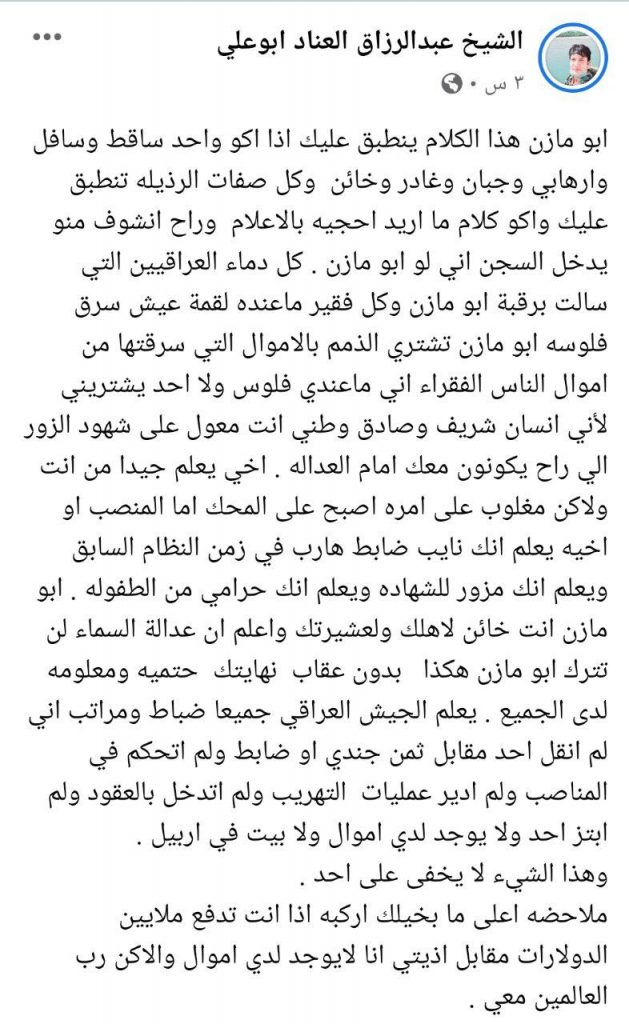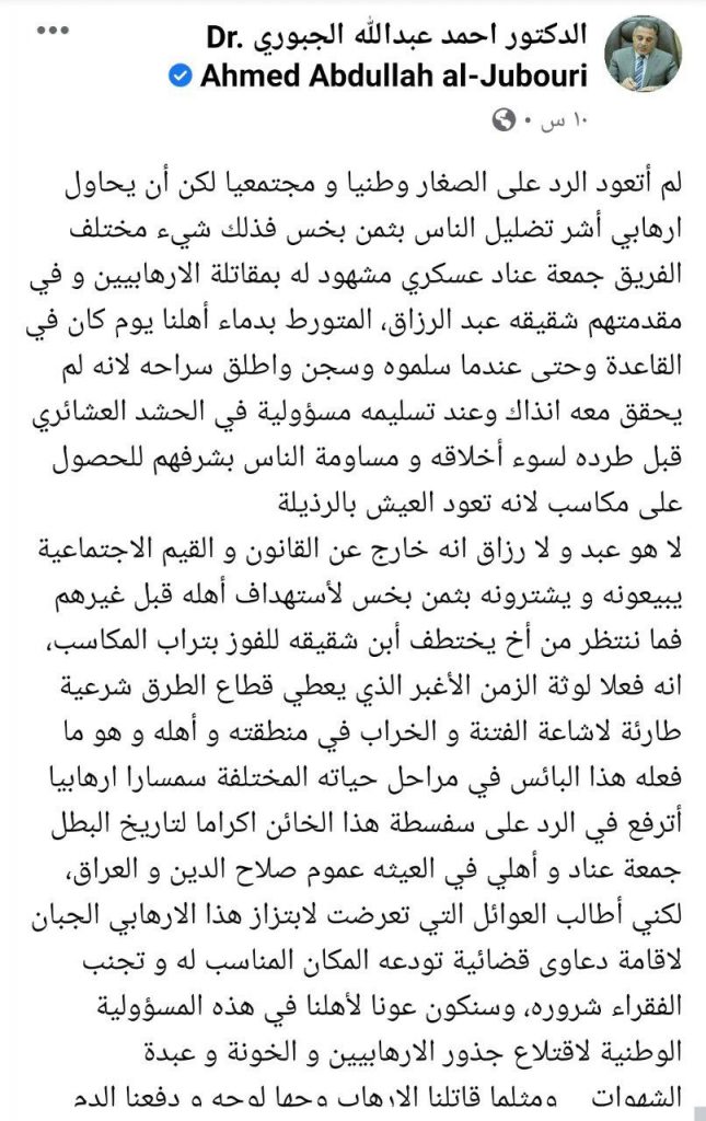 شهدت المكون السني وتحديدا في عشيرة الجبور صراع كبير بين محافظ صلاح الدين السابق ابو مازن واخ وزير الدفاع الحالي جمعة عناد.